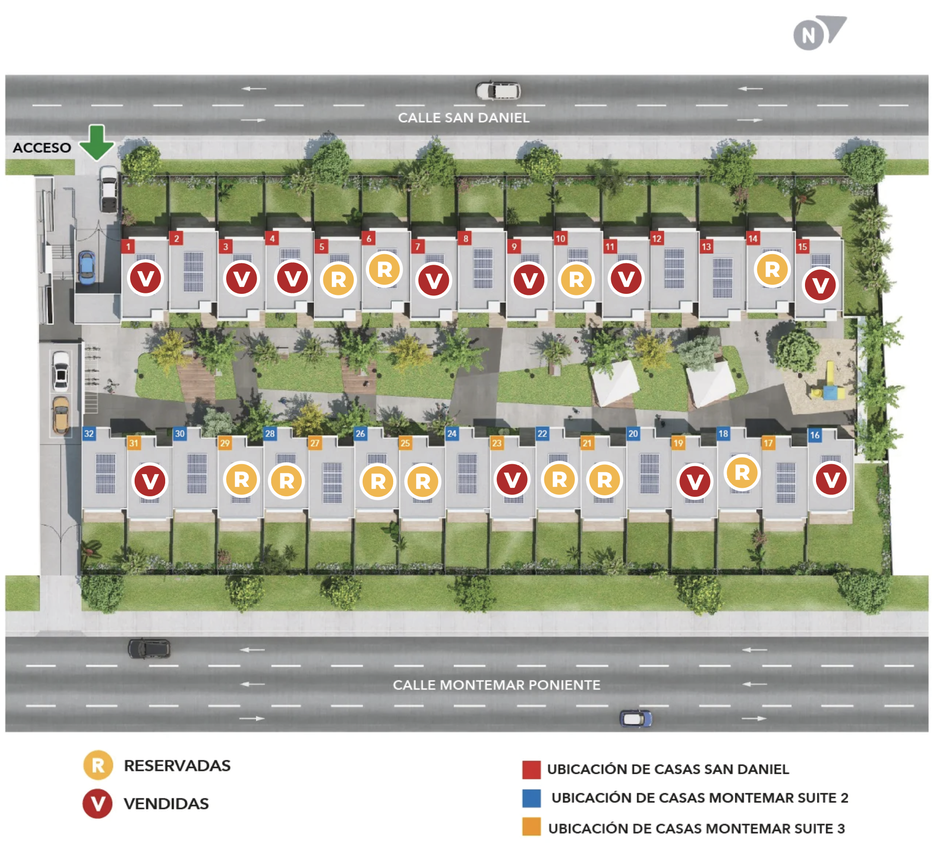 Solo 32 casas en condominio con acceso controlado, estacionamiento subterráneo y una gran plaza central de 1400 m2, sin tránsito vehicular, que dinamiza el espacio e invita a disfrutar con seguridad al aire libre.